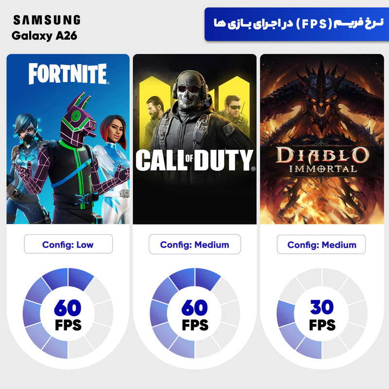 Samsung Galaxy A26 به چیپست 1380 Exynos مجهز شده است. این تراشه با چهار هسته قدرتمند A78 با فرکانس ۲.۴ گیگاهرتز، توان پردازشی قابل قبولی ارائه میدهد و در کنار پردازنده گرافیکی Mali G68 MP5، اجرای روان اپلیکیشنها، مرور وب، و اجرای چند برنامه به طور همزمان را تضمین میکند. البته باید به این نکته توجه کنیم که این گوشی برای اجرای بازیهای سنگین طراحی نشده است، اما برای بازیهای سبک تا متوسط مثل Call of Duty Mobile یا PUBG روی تنظیمات متوسط کاملاً قابل قبول است.